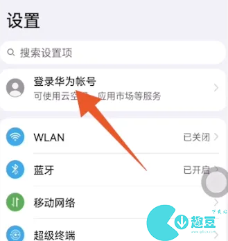 1、首先开启手机设置功能,接着点击顶部的“华为账号登录”选项。