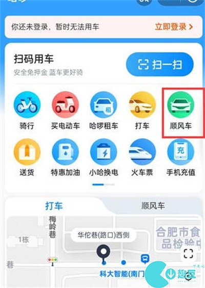 进入哈啰之后,我们找到首页右上角的顺风车功能,点击进入。