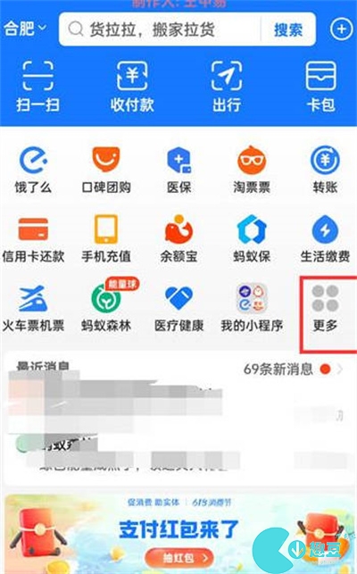 我们打开支付宝软件,然后我们点击首页的更多功能,如图所示。